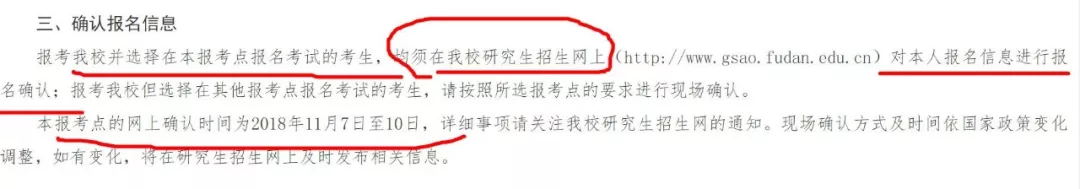 選擇復旦大學為報考點的考生請于2018年11月7日至10日,登錄復旦大學研究生招生網上(http://www.gsao.fudan.edu.cn)對本人報名信息進行報名確認;報考復旦但選擇在其他報考點報名考試的考生,請按照所選報考點的要求進行現場確認。