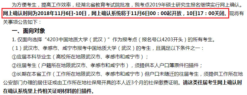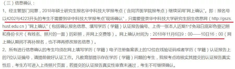 2018年碩士研究生報名華中科技大學報考點(含同濟醫學院報考點)報名號為4202與4223開頭的考生繼續采用“網上確認”,網上確認時間為11月6日9:00至10日16:00。