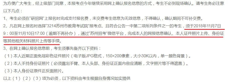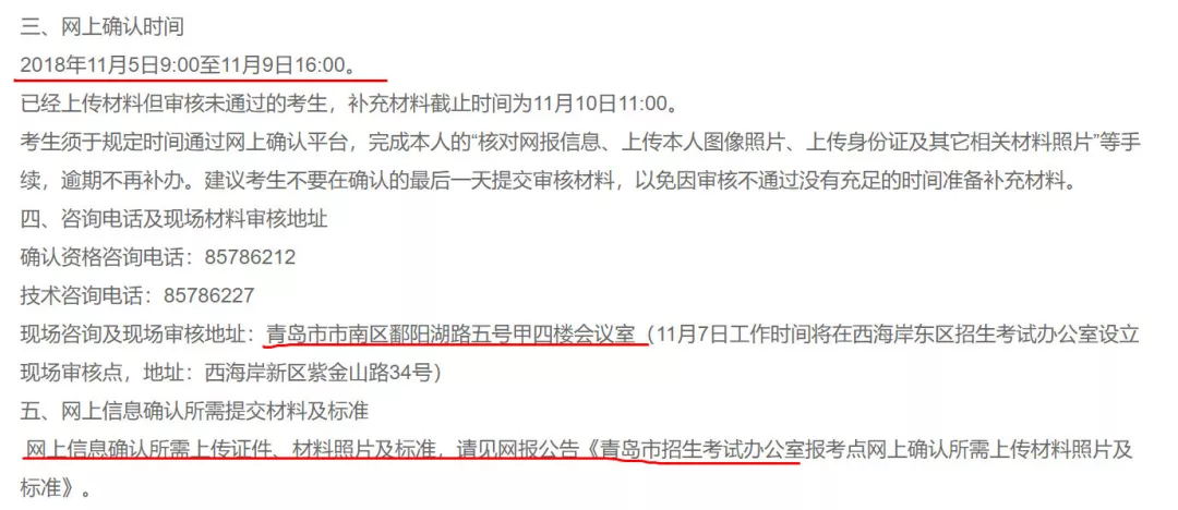 網上確認時間:2018年11月5日9:00至11月9日16:00。 已經上傳材料但審核未通過的考生,補充材料截止時間為11月10日11:00。 考生須于規定時間通過網上確認平臺,完成本人的“核對網報信息、上傳本人圖像照片、上傳身份證及其它相關材料照片”等手續,逾期不再補辦。建議考生不要在確認的最后一天提交審核材料,以免因審核不通過沒有充足的時間準備補充材料。