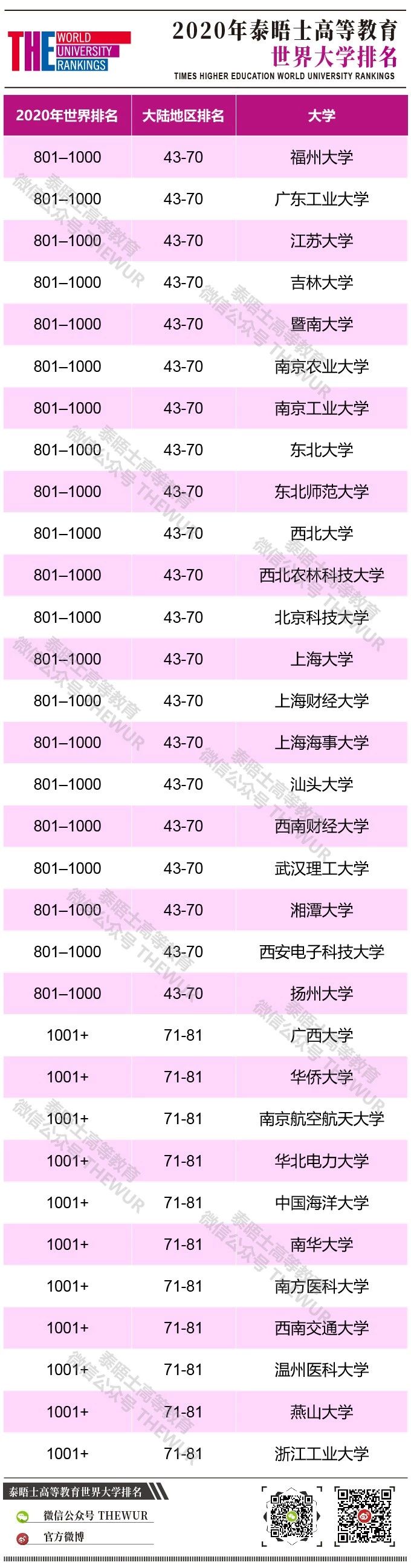 中國大陸今年有10所大學新加入排名。其中表現最好的是北京師范大學, 排名位于301—350區間。北京師范大學是中國政府雙一流大學計劃的受益者之一,中國計劃在2050年年底之前將一批精英高校和學院發展成世界一流的大學和學科。