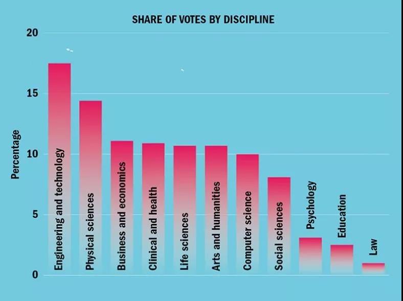 為了更好地反映來自各個學(xué)科的學(xué)者的意見,并與去年的聲譽(yù)排名進(jìn)行直接比較,我們在2018-2019的聲譽(yù)調(diào)查中按學(xué)者的學(xué)科專業(yè)調(diào)整每份聲譽(yù)投票的權(quán)重。調(diào)整后的學(xué)科類聲譽(yù)調(diào)查的占比如下:物理科學(xué)(14.6%),臨床和健康(14.5%),生命科學(xué)(13.4%),商業(yè)和經(jīng)濟(jì)學(xué)(13.1%),工程學(xué)(12.7%),藝術(shù)和人文科學(xué)( 12.5%),社會科學(xué)(8.9%),計算機(jī)科學(xué)(4.2%),教育學(xué)(2.6%),心理學(xué)(2.6%),法律(0.9%)。
