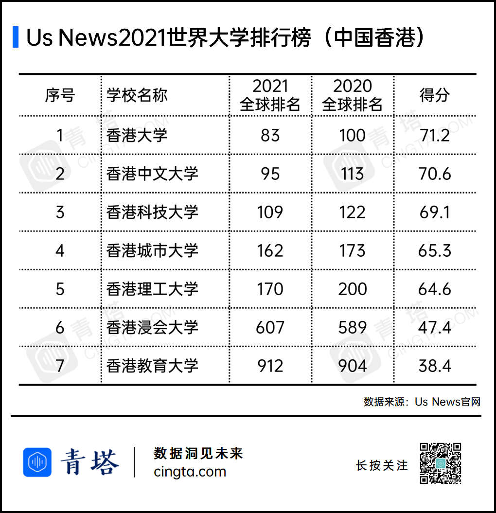 中國香港地區共有7所高校上榜,排名最高的是香港大學,居全球83位。