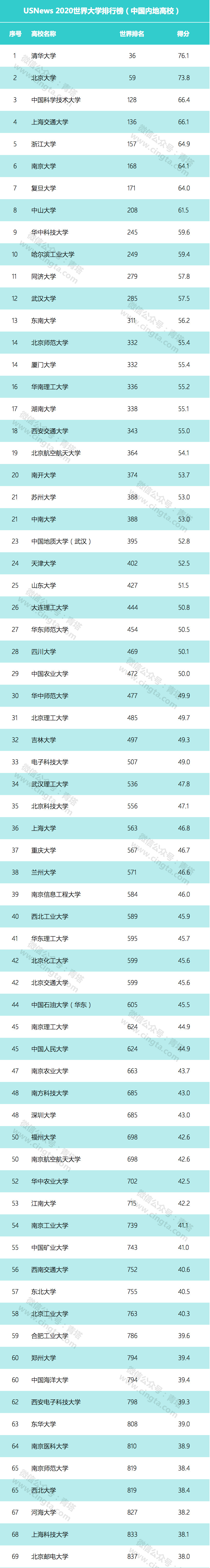 中國共有223所高校入圍 USNews2020世界大學(xué)排行榜,相比去年增加62所高校。其中內(nèi)地高校188所,香港高校7所,澳門高校2所,臺灣高校26所。相較去年,中國高校整體排名有所進步。