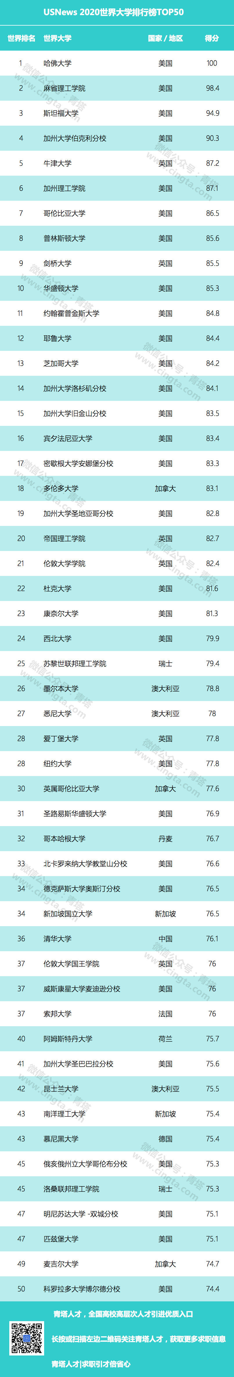 USNews2020世界大學(xué)排行榜TOP50高校詳細名單如下: