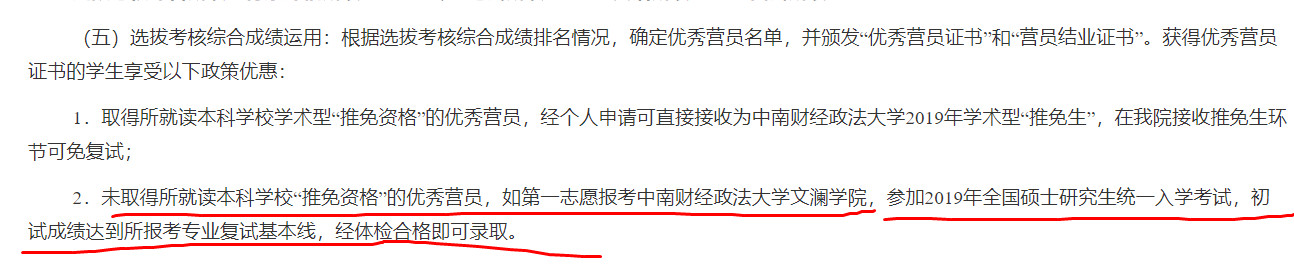 如:中南財經大學文瀾學院:如果獲得優(yōu)秀營員但未獲得本校推免資格,參加全國統考的考生,只要過復試分數線,體檢合格可直接錄取,也就是免復試。