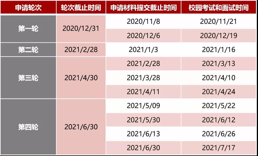 2) 條件錄取 準備或已預(yù)約參加雅思/托福等標準化考試的申請人如通過審核資格,可以先參加面試筆試,通過面試筆試后將收到“條件錄取”的結(jié)果。此類申請人須在2021年6月30日之前提交合格的考試成績以獲得正式錄取資格。