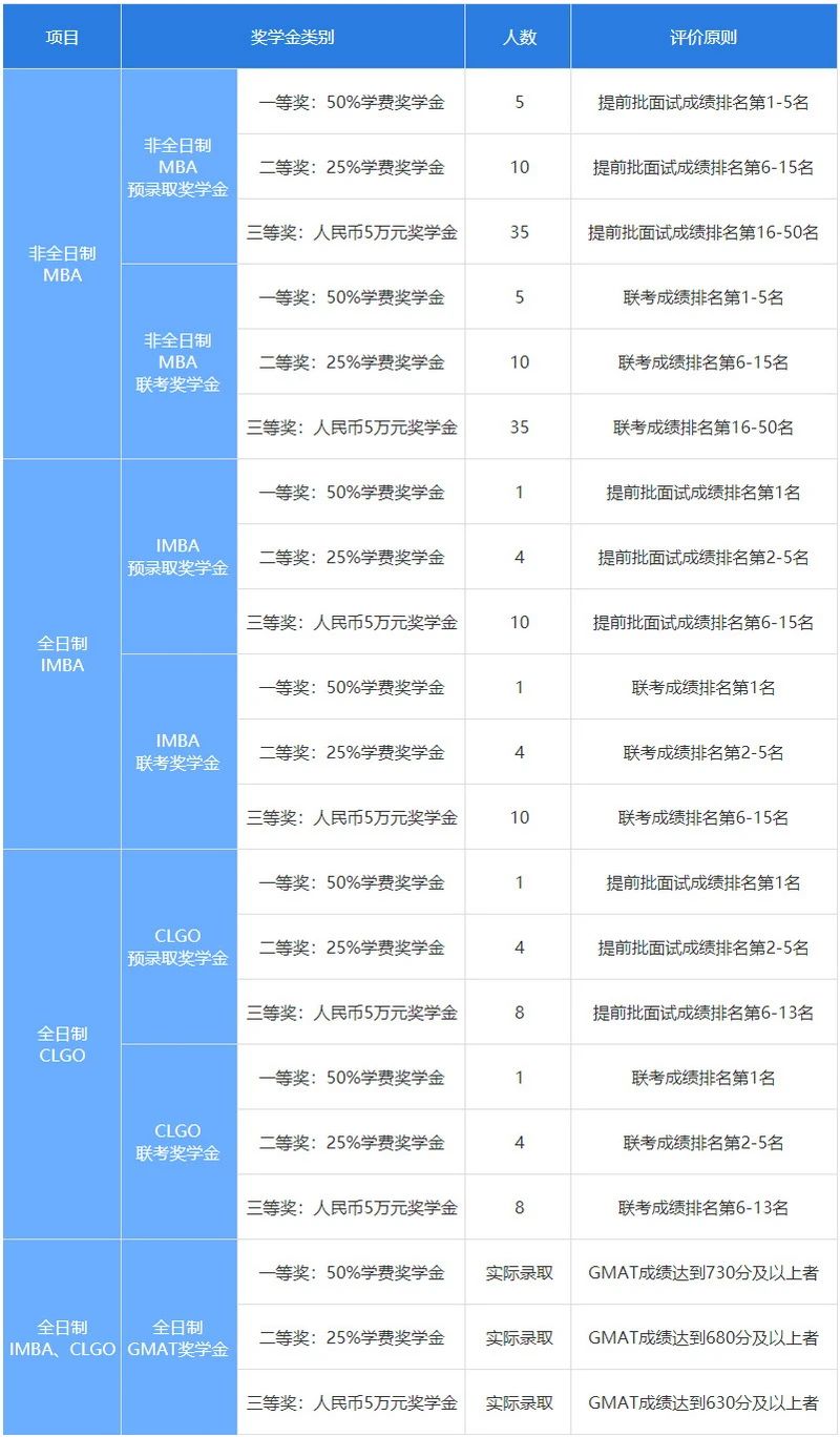 授予面試或筆試成績優異的非全日制MBA(包括綜合、金融、人工智能三分方向)、全日制IMBA和全日制CLGO新生。