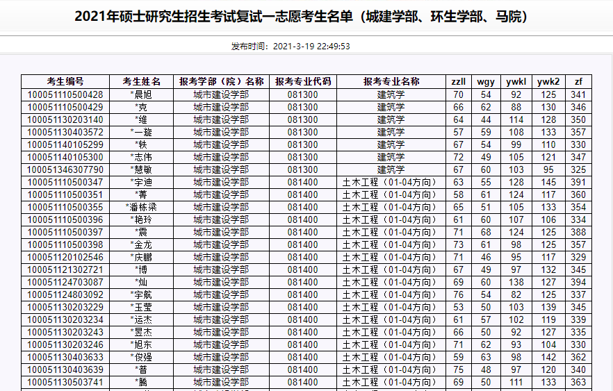 原文標題:2021年碩士研究生招生考試復試一志愿考生名單(城建學部、環生學部、馬院)