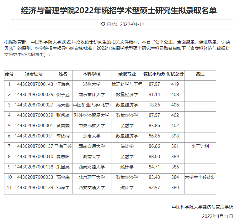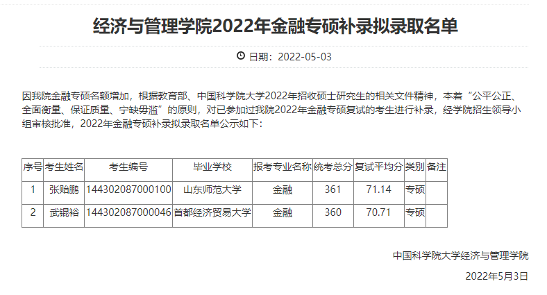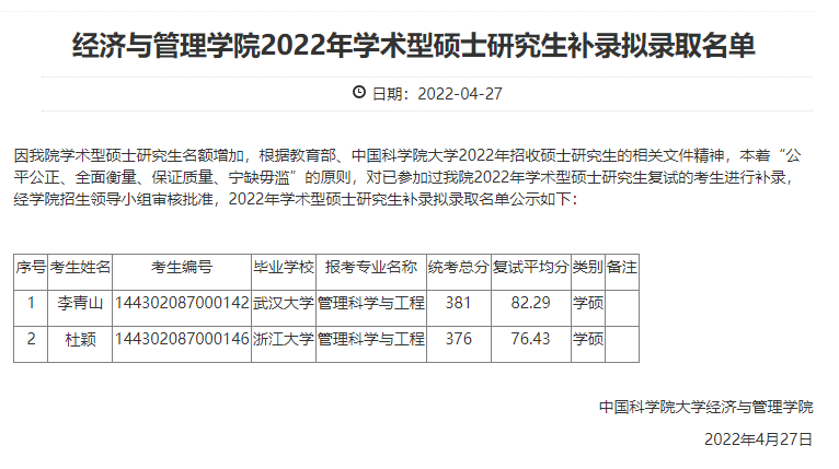 經濟與管理學院2022年學術型碩士研究生補錄擬錄取名單