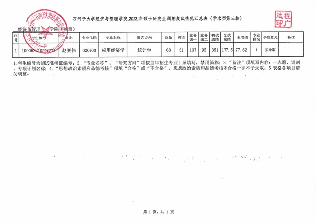 2022年石河子大學經濟與管理學院碩士研究生(學術型)調劑考生(第三輪)擬錄取名單公示如下(公示時間不少于10個工作日)。