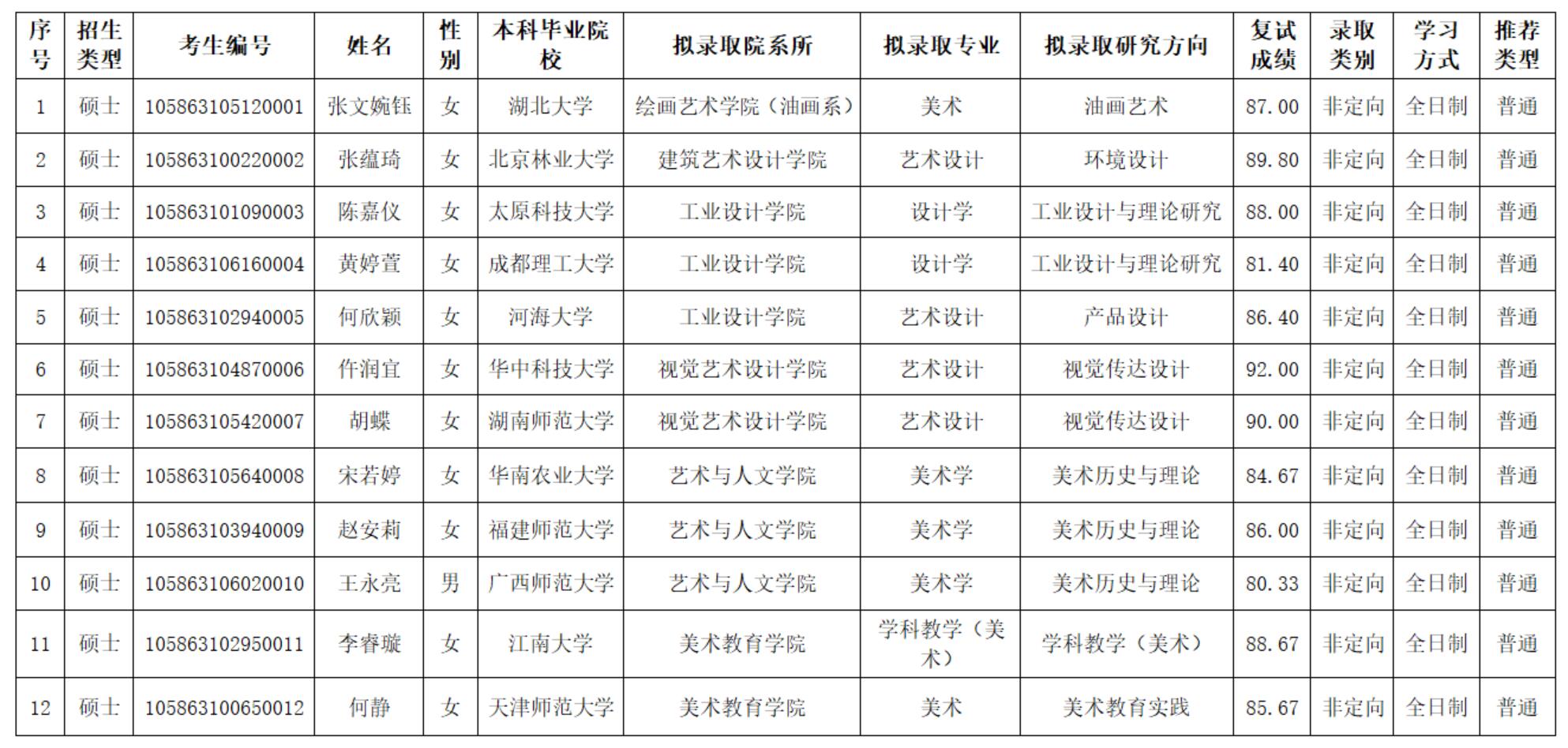 根據(jù)《廣州美術(shù)學(xué)院2023年接收校外優(yōu)秀應(yīng)屆畢業(yè)生免試攻讀碩士學(xué)位研究生辦法》、《廣州美術(shù)學(xué)院2023年接收校外優(yōu)秀應(yīng)屆畢業(yè)生免試攻讀碩士學(xué)位研究生復(fù)試工作安排》,綜合審查考生的報(bào)名資料、復(fù)試成績(jī)、體檢結(jié)果、思想政治品德考核情況,擬錄取12名校外推免生為我校2023年碩士研究生,并報(bào)教育部審核,最終錄取結(jié)果以教育部錄取檢查審核通過(guò)為準(zhǔn)。擬錄取名單公示如下: