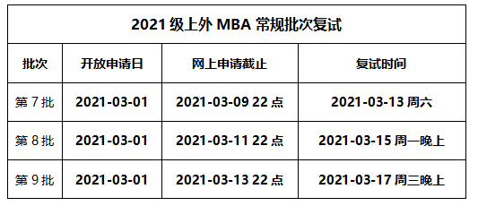 以上就是“2021MBA復(fù)試:上海外國語大學(xué)2021級MBA常規(guī)批次復(fù)試啟動”全部內(nèi)容,更多相關(guān)信息,請持續(xù)關(guān)注本網(wǎng)站。