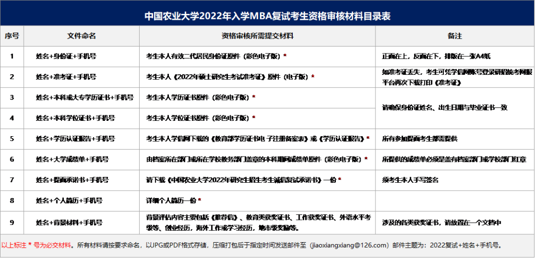 參加復試的考生必須進行資格審查,對不符合報名資格者,不予復試,不得錄取,請按上述材料目錄表在規定的時間內發送至指定審核郵箱。
