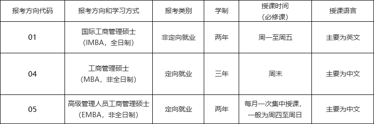 管理學院2021年計劃面向全國招收工商管理碩士學位研究生(招生計劃人數待定,請留意后續更新),包括工商管理碩士(MBA,非全日制)、國際工商管理碩士(IMBA,全日制)、高級管理人員工商管理碩士(EMBA,非全日制)三個報考方向。