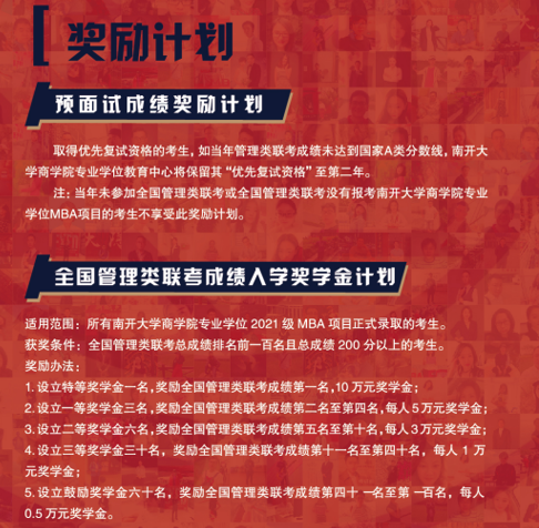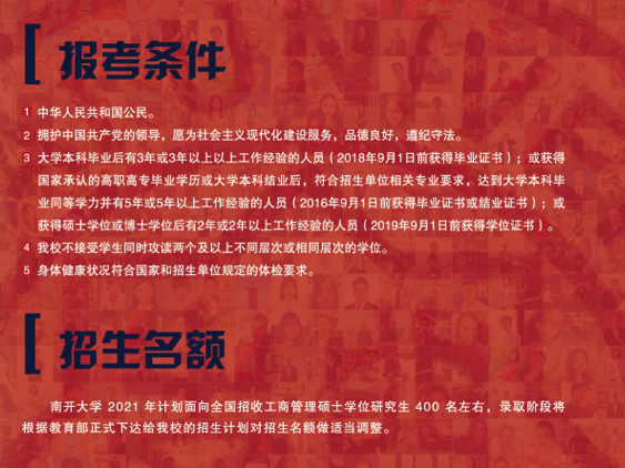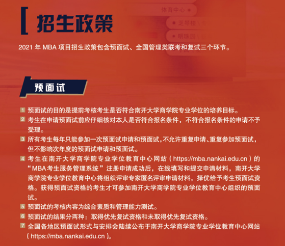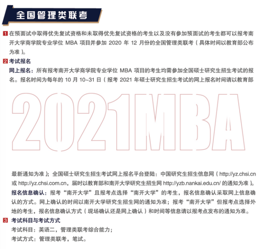 以上就是“2021MBA招生簡章:南開大學(xué)2021年工商管理碩士(MBA)招生簡章”的內(nèi)容了,更多考研信息,請持續(xù)關(guān)注研線網(wǎng)。