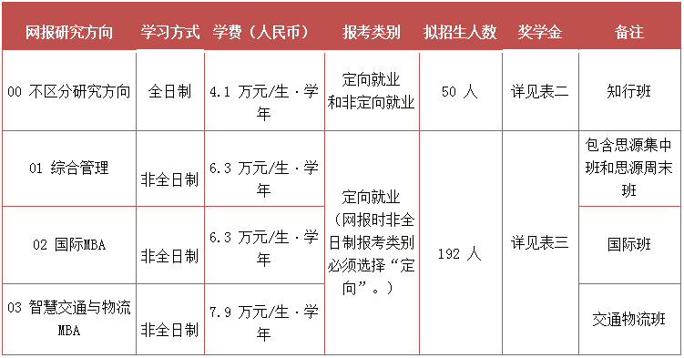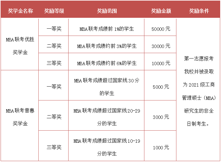 為了鼓勵(lì)優(yōu)秀人才攻讀非全日制工商管理碩士(MBA),培養(yǎng)更多品學(xué)兼優(yōu)的商界精英,北京交通大學(xué)MBA教育中心特設(shè)立MBA聯(lián)考優(yōu)勝獎(jiǎng)學(xué)金、MBA聯(lián)考普惠獎(jiǎng)學(xué)金。其獎(jiǎng)勵(lì)范圍、獎(jiǎng)金額度和獎(jiǎng)勵(lì)對(duì)象如表三所示。2021級(jí)非全日制MBA新生獎(jiǎng)學(xué)金評(píng)選辦法詳見后續(xù)通知。若有變動(dòng),均以具體通知為準(zhǔn)。