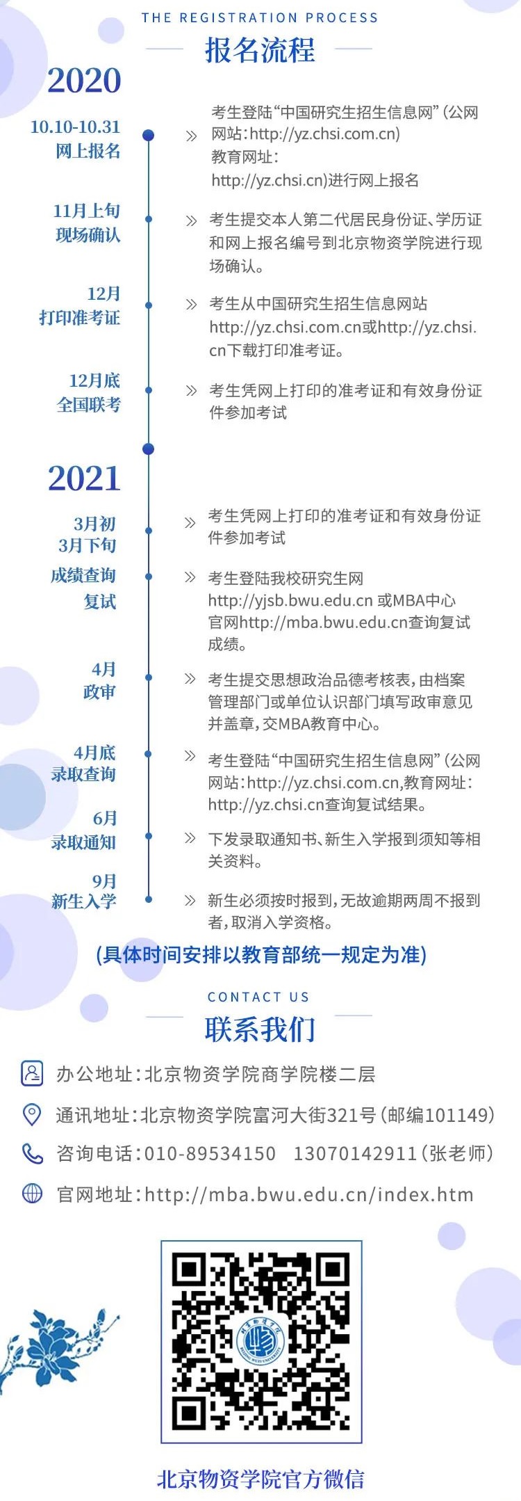 以上就是“2021MBA招生簡章:北京物資學院2021年工商管理碩士(MBA)招生簡章”的內容了,更多考研信息,請持續關注,預祝大家考研成功!