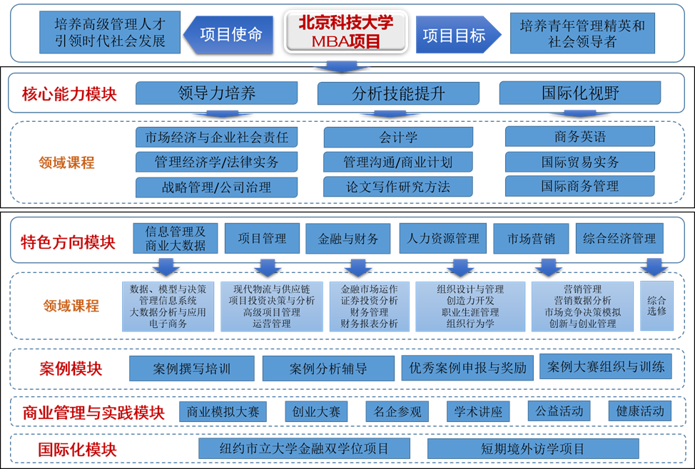 MBA課程體系充分考慮課程對(duì)中國(guó)管理問(wèn)題的適應(yīng)性和對(duì)全球市場(chǎng)發(fā)展的前瞻性,借助中國(guó)經(jīng)濟(jì)高速發(fā)展的強(qiáng)勁動(dòng)力和北京科技大學(xué)經(jīng)濟(jì)管理學(xué)院的優(yōu)質(zhì)學(xué)術(shù)和實(shí)踐資源,意在培養(yǎng)諳熟中國(guó)國(guó)情的青年管理精英和社會(huì)領(lǐng)導(dǎo)者,為民族發(fā)展培養(yǎng)杰出的管理人才!
