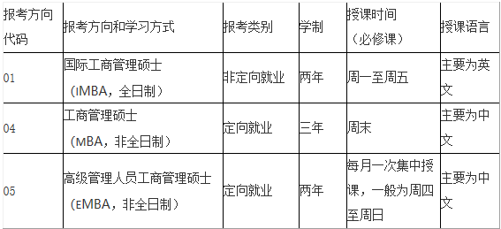 管理學院2022年計劃面向全國招收工商管理碩士學位研究生(招生計劃人數待定,請留意后續更新),包括工商管理碩士(MBA,非全日制)、國際工商管理碩士(IMBA,全日制)、高級管理人員工商管理碩士(EMBA,非全日制)三個報考方向。