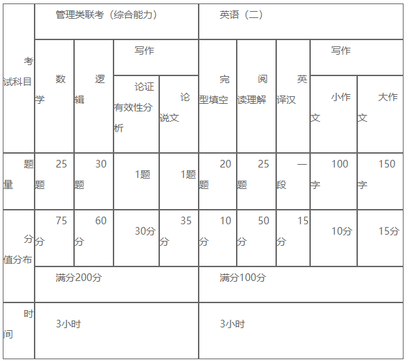 管理類聯考綜合能力(199)(包含數學75、寫作65、邏輯60,共200分)、英語二(204)(共100分)。