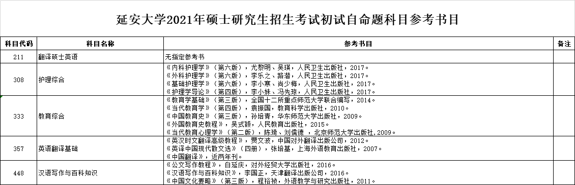 以上就是“2021考研參考書目:延安大學(xué)2021年碩士研究生招生考試初試自命題科目參考書目”的全部內(nèi)容!更多2021考研院校參考書目等干貨,盡在研線網(wǎng)!