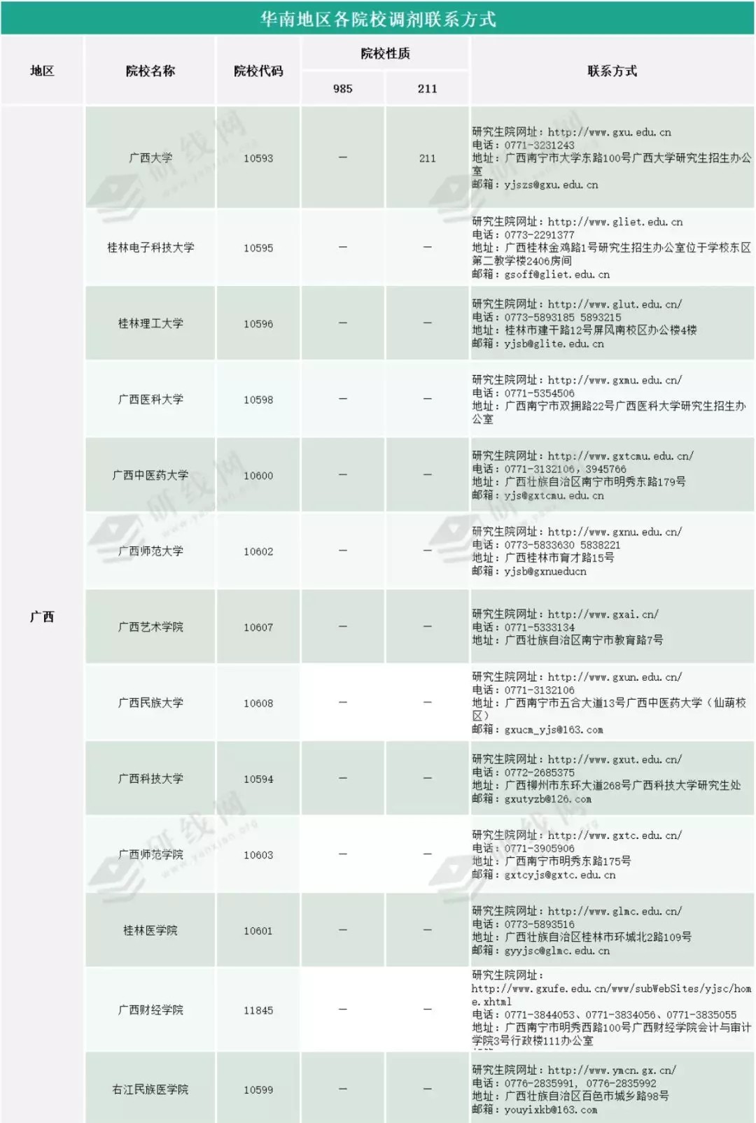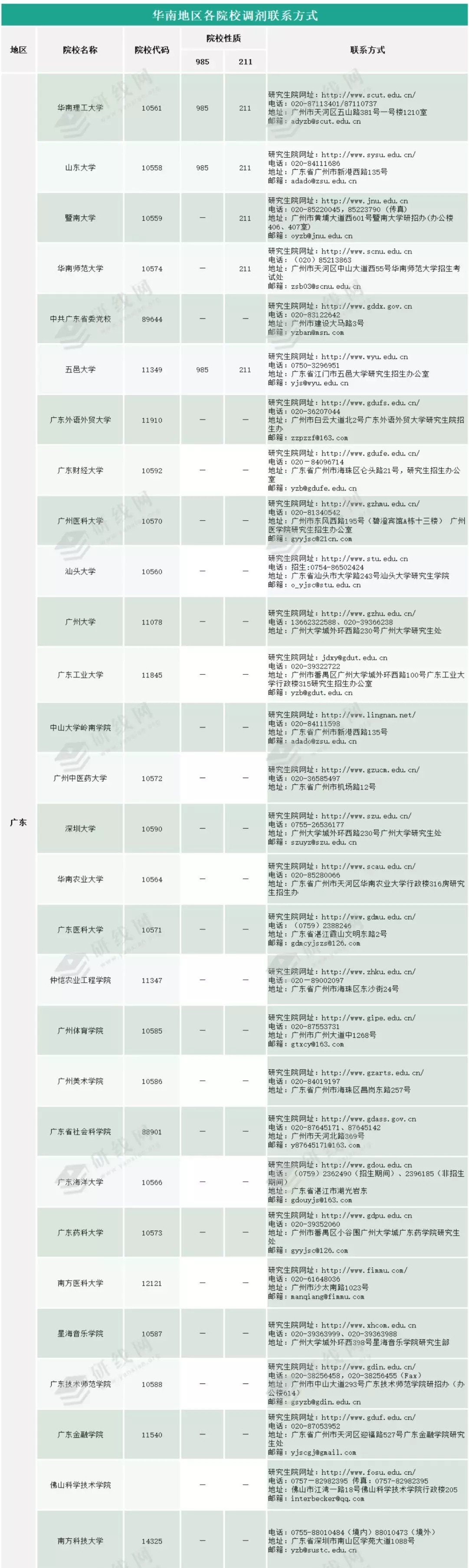 2020年華南地區院校調劑聯系方式查詢