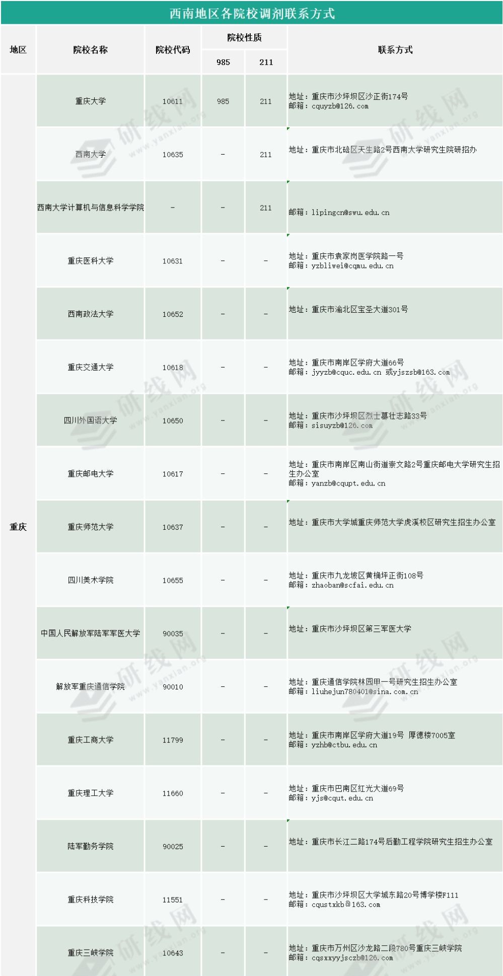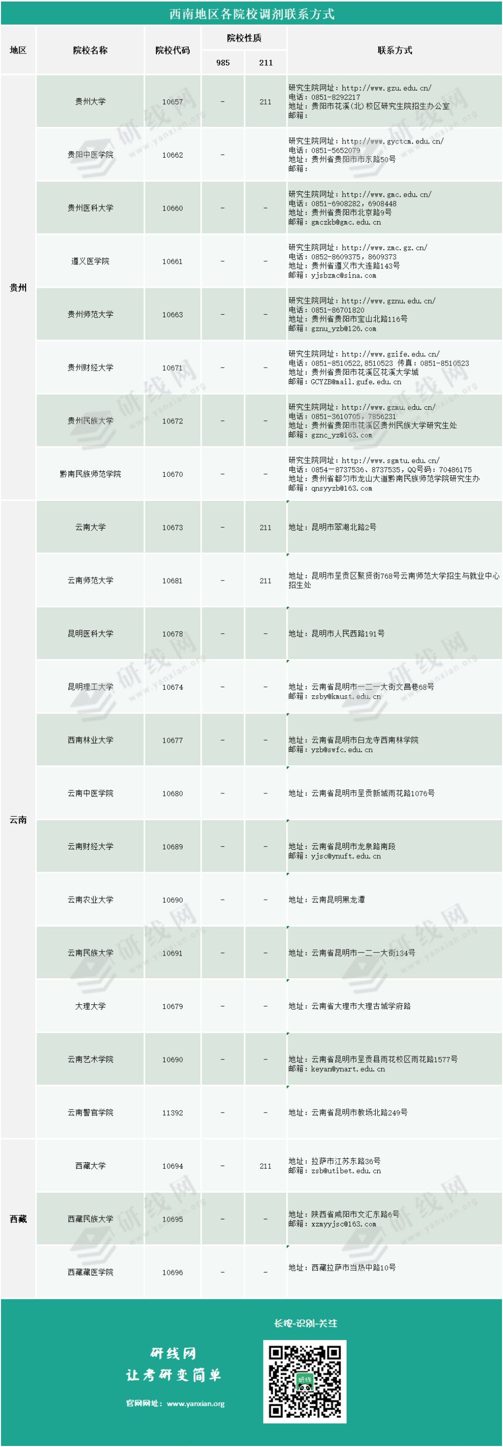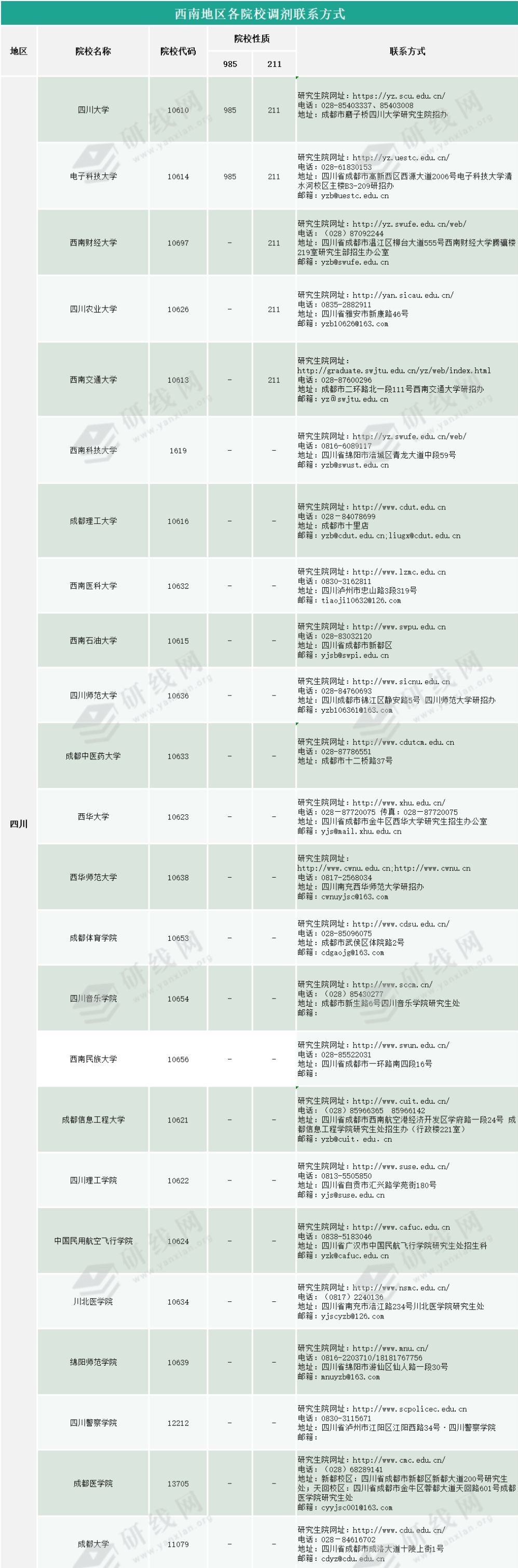 以上就是“2020年西南地區院校調劑聯系方式查詢”的全部內容,更多調劑相關內容,請關注“調劑信息”欄目。祝您考研成功!
