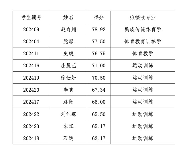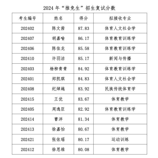 南京體育學院2024年擬接收“推免生”名單公示根據《南京體育學院2024年接收推薦免試攻讀研究生章程》的相關規定與工作安排,經面試、英語測試、技能測試等環節考核,我校擬錄取以下同學免試攻讀碩士研究生,現將名單公示如下,公示期自即日起10個工作日,對名單如有異議者,請致電:025-84755173
