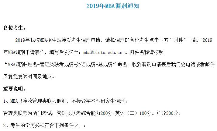 2019年我校MBA招生現接受考生調劑申請,請擬調劑的各位考生點擊下方“附件”下載“2019年MBA調劑申請表”,填寫后發(fā)送至:mba@bistu.edu.cn 。