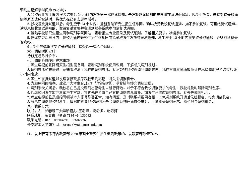 以上就是“2020考研調劑信息:長春理工大學2020年碩士研究生招生調劑信息”的全部內容!更多考研調劑內容,請關注考研調劑信息欄目