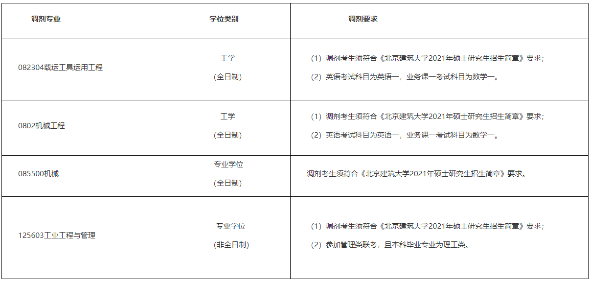 以上就是小編整理“2021考研調劑:北京建筑大學機電與車輛工程學院接收2021年碩士研究生調劑信息”的全部內容,想了解更多調劑信息,請持續關注本網站。