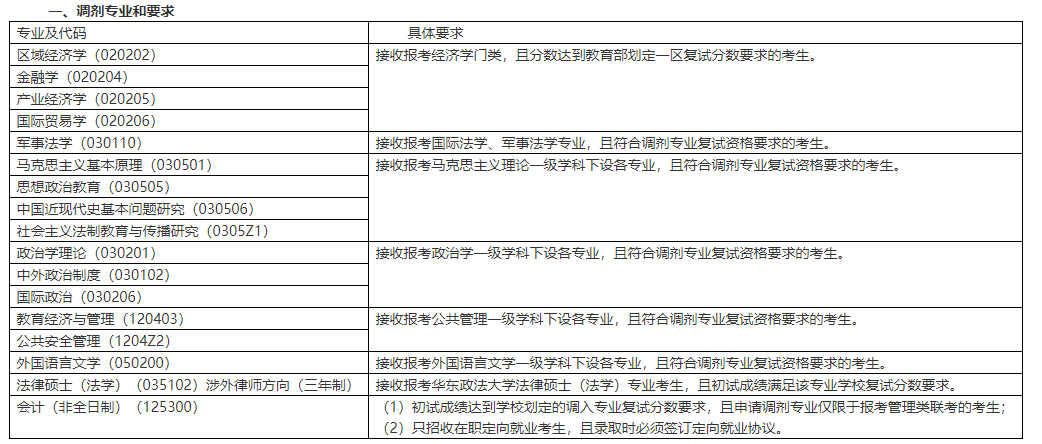 根據(jù)《教育部關(guān)于印發(fā)〈2021年全國(guó)碩士研究生招生工作管理規(guī)定〉的通知》(教學(xué)函[2020]8號(hào))和教育部《關(guān)于做好2021年全國(guó)碩士研究生招生錄取工作的通知》》(教學(xué)司[2021]2號(hào))文件精神,結(jié)合我校2021年碩士研究生招生工作的實(shí)際情況,現(xiàn)發(fā)布華東政法大學(xué)碩士研究生相關(guān)專業(yè)(方向)調(diào)劑通知。