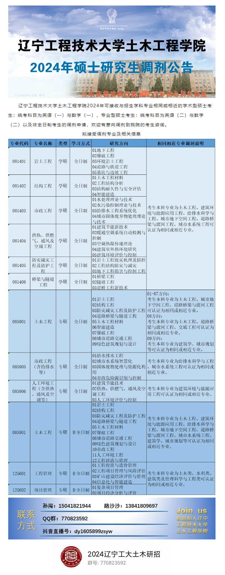以上就是小編整理“2024考研調劑:遼寧工程技術大學土木工程學院2024年碩士研究生調劑公告”的全部內容,想了解更多調劑信息,請持續關注本網站。