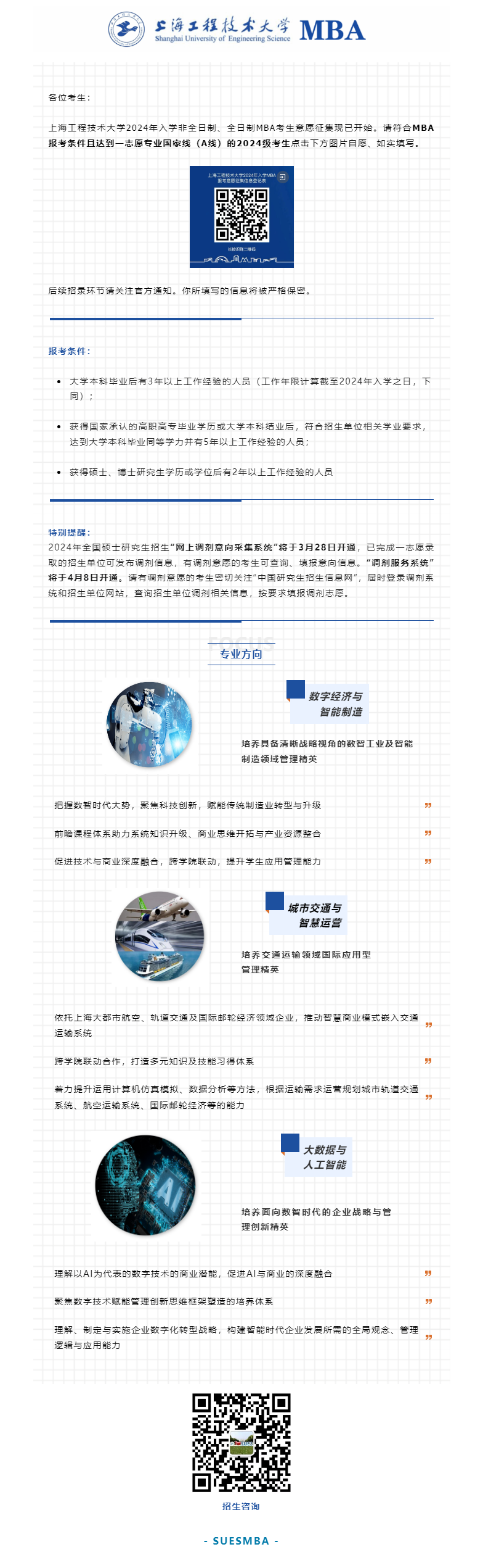 以上就是小編整理“2024考研調劑:上海工程技術大學2024年入學MBA考生意愿征集”的全部內容,想了解更多調劑信息,請持續關注本網站。