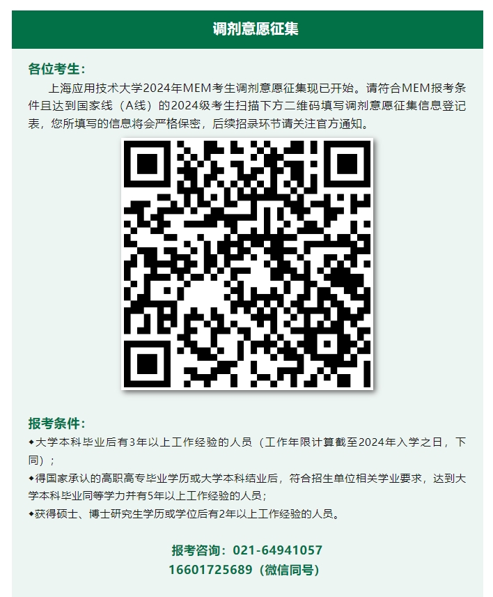 2024考研調劑:2024上海應用技術大學MEM調劑意愿征集已開啟!