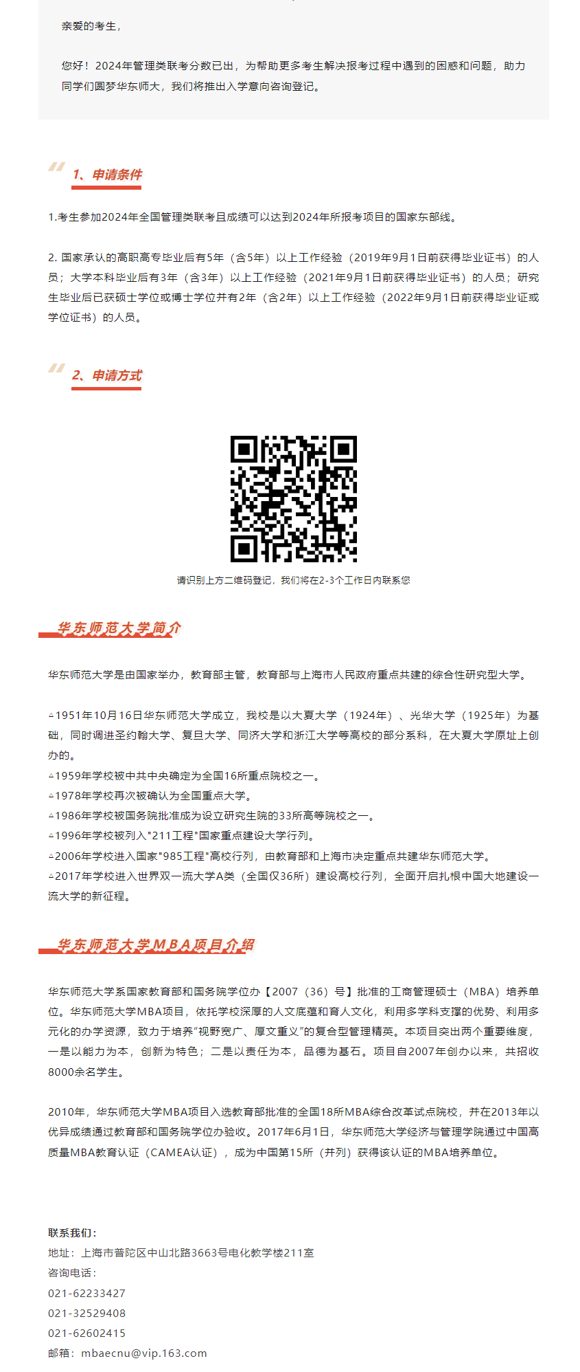 以上就是小編整理“2024考研調劑:2024年華東師范大學MBA入學意向登記”的全部內容,想了解更多調劑信息,請持續關注本網站。