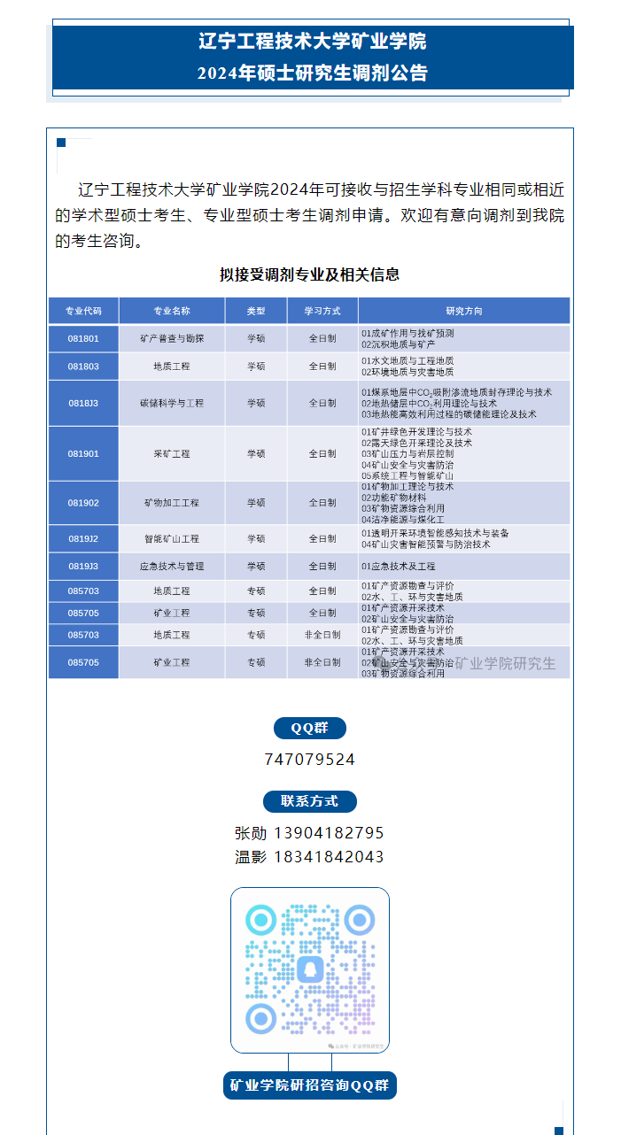 以上就是小編整理“2024考研調劑:遼寧工程技術大學礦業學院2024年碩士研究生調劑公告”的全部內容,想了解更多調劑信息,請持續關注本網站。