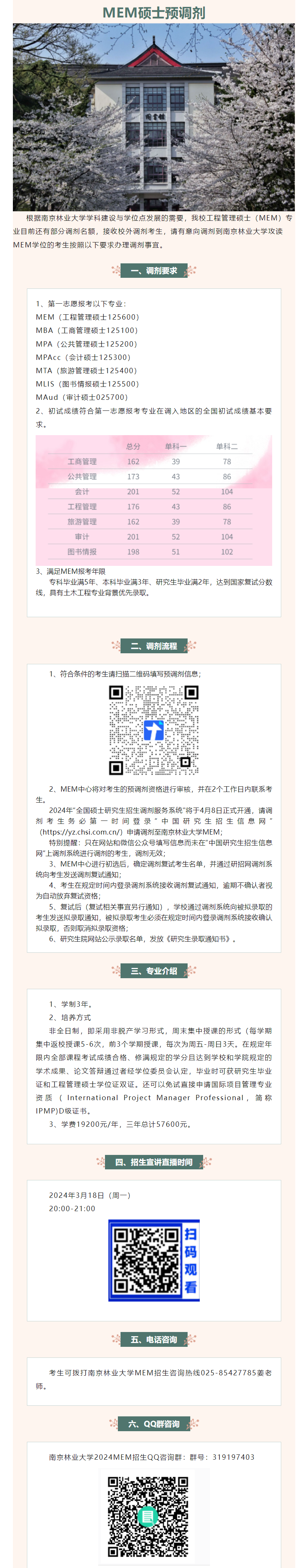 以上就是小編整理“2024考研預調劑:南京林業大學2024年工程管理碩士(MEM)預調劑通知”的全部內容,想了解更多調劑信息,請持續關注本網站。