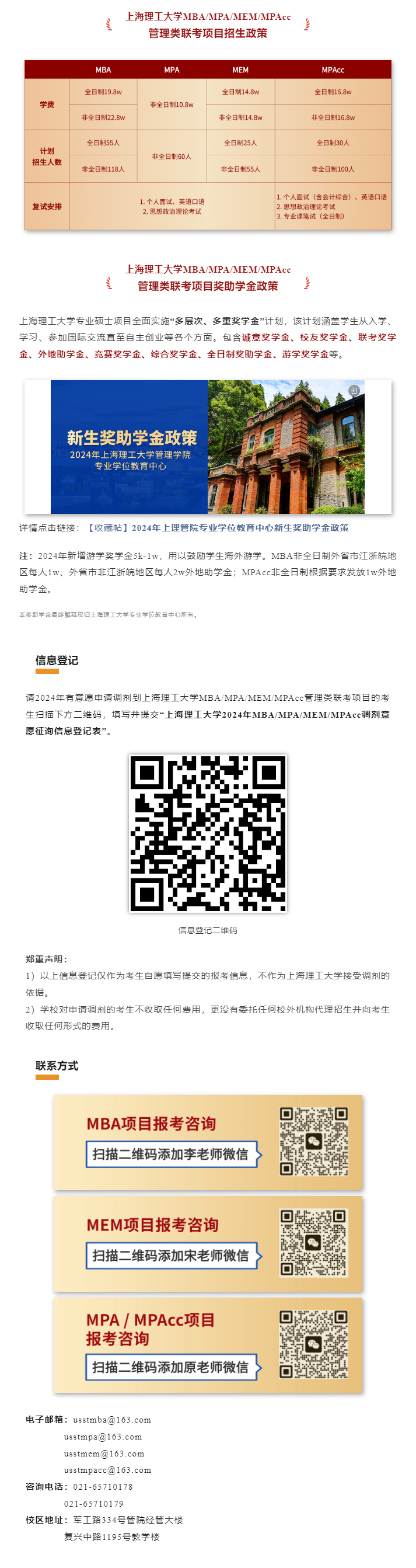 以上就是小編整理“2024考研調劑:上海理工大學2024年MBA/MPA/MEM/MPAcc管理類聯考項目調劑意愿征詢信息通知”的全部內容,想了解更多調劑信息,請持續關注本網站。