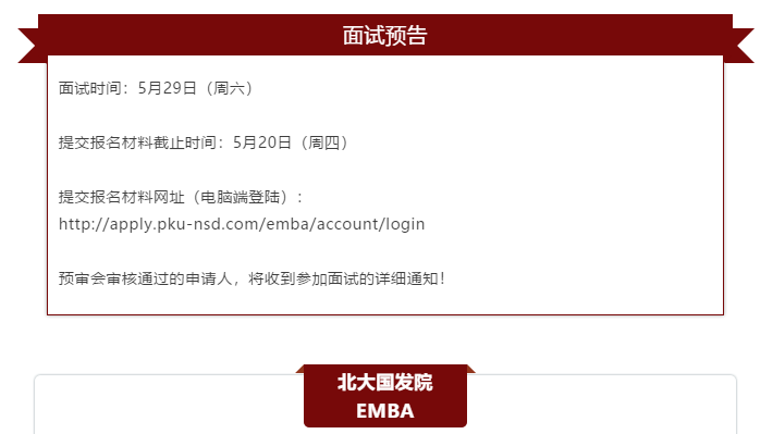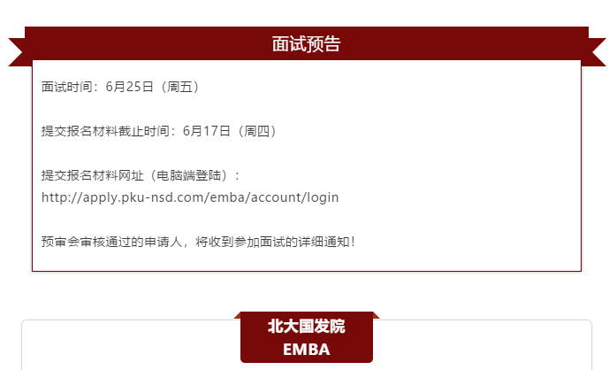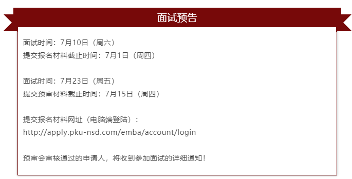 申請人完整填寫北大國發院EMBA申請資料后,由國發院招生專家組對申請資料進行審查,通過審查者獲得面試資格。