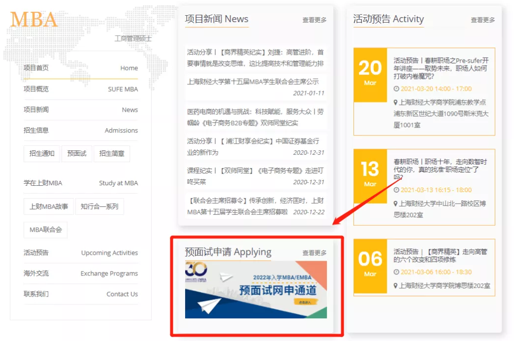 (https://cob.sufe.edu.cn/MBA)點(diǎn)擊“2022MBA預(yù)面試申請(qǐng)”(如紅框所示)進(jìn)入。