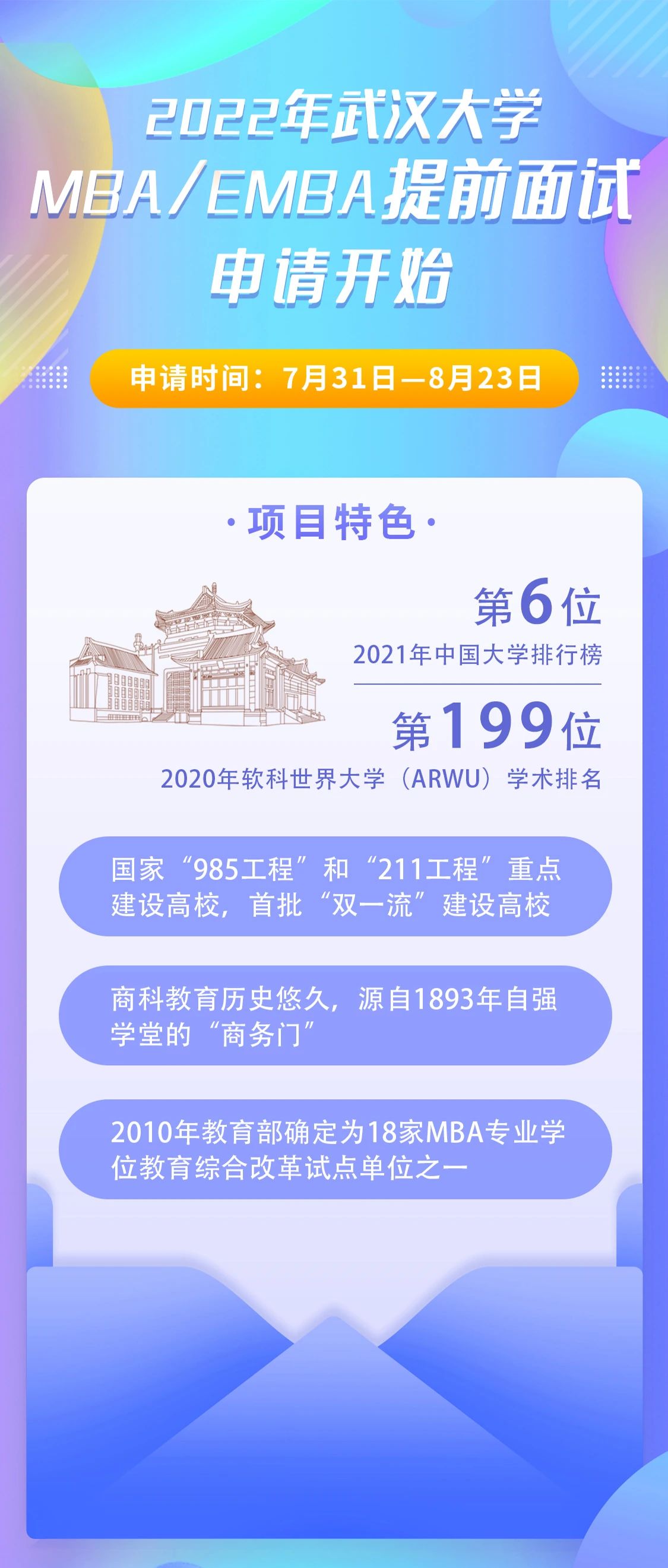 原文標題:提面報名 | 2022年武漢大學工商管理碩士(MBA、EMBA)提前面試申請開始!