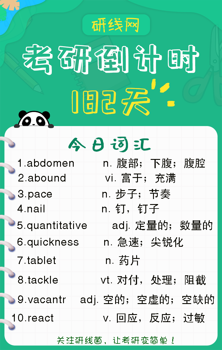 以上是研線網為考生整理的“2020考研英語詞匯高頻詞匯(2)”相關內容,希望對大家有幫助,研線網小編預祝大家都能取得好成績!更多英語詞匯相關內容盡在研線網考研詞匯欄目。