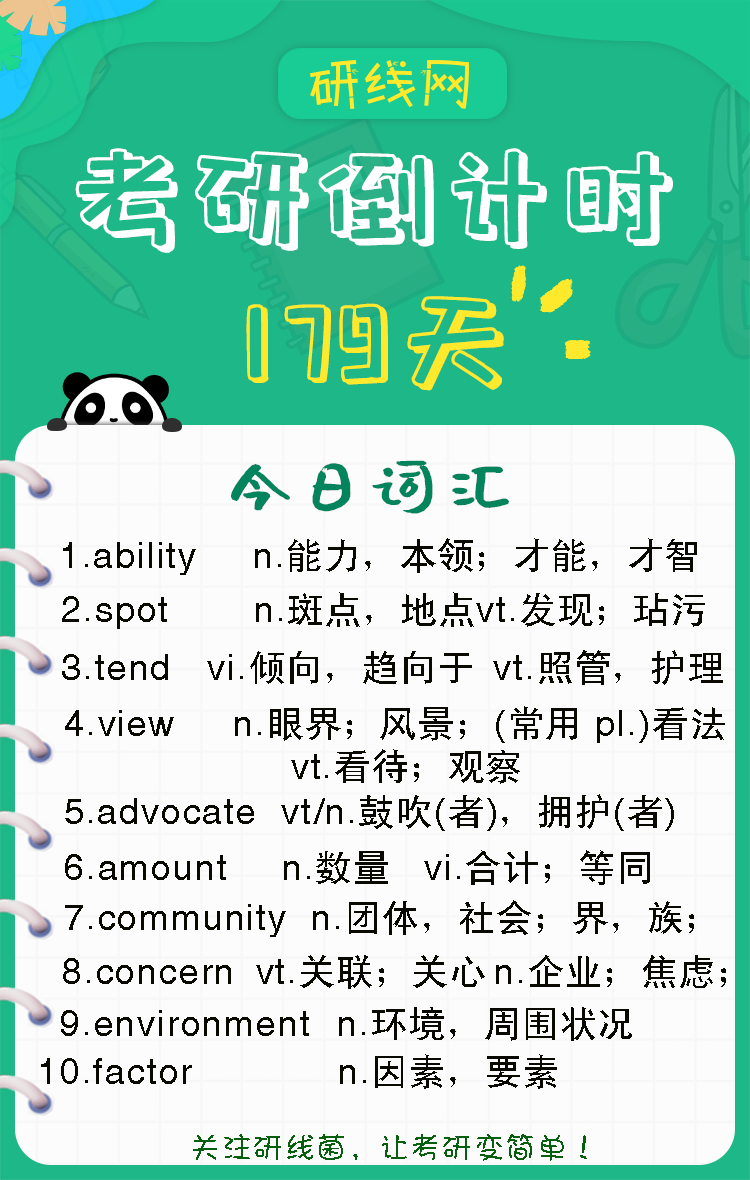 以上是研線網(wǎng)為考生整理的“2020考研英語詞匯高頻詞匯(6)”相關(guān)內(nèi)容,希望對大家有幫助,研線網(wǎng)小編預(yù)祝大家都能取得好成績!更多英語詞匯相關(guān)內(nèi)容盡在研線網(wǎng)!