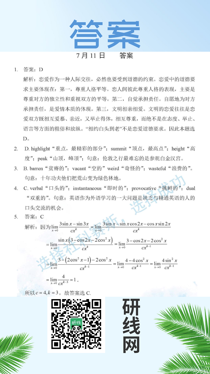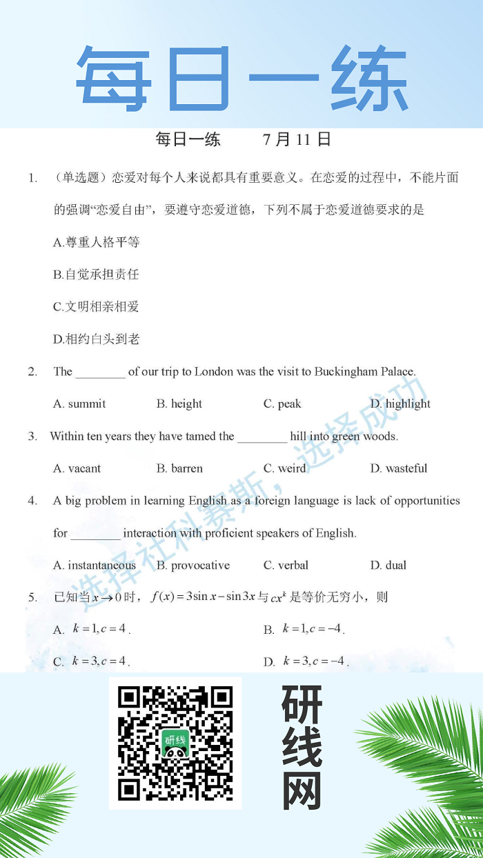 7月11日:2020考研學碩每日一練以及答案