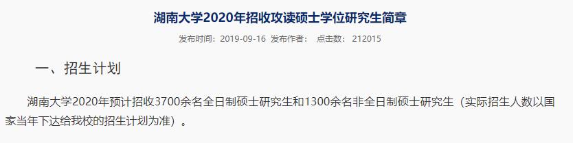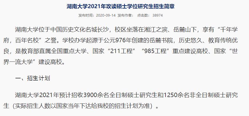 湖南大學2020年全日制研究生招生計劃約為3700名,2021年全日制招生計劃約為3900名,同比增長200名。