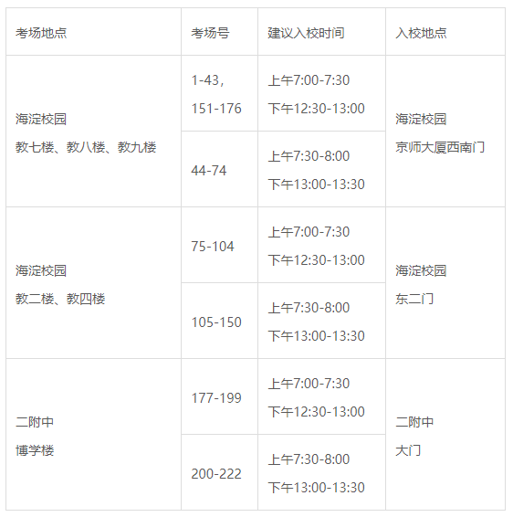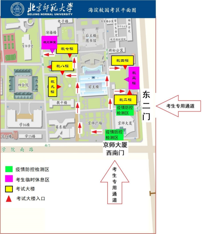 (1)12月25日-26日上午7:00開始,下午12:30開始,海淀校園考生在校園東二門(京師大廈東側)、京師大廈西南門進行防疫檢測,檢測合格后方可正常進入校園參加考試(注意:校園其他校門不設防疫檢測點,不對考生開放);二附中考生由二附中大門進入校園,進行防疫檢測,合格后方可正常進入校園參加考試。