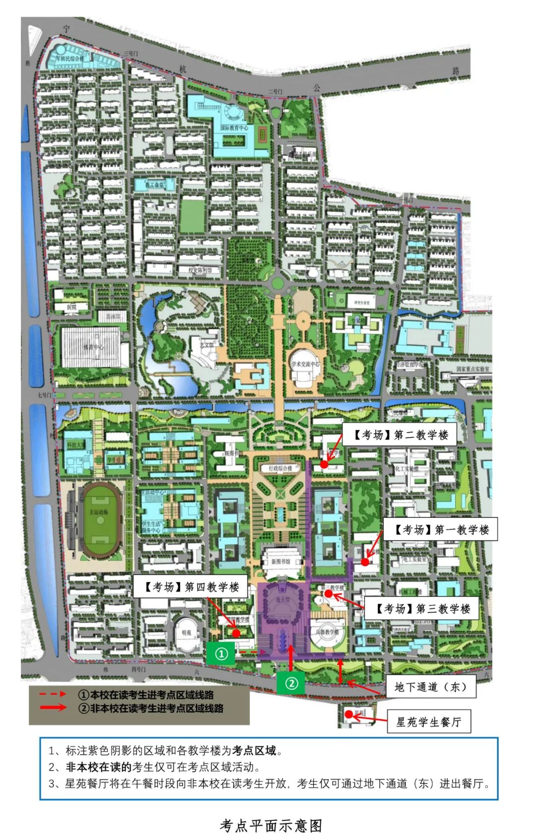 校內考點區域實行封閉管理,進入考點區域的考生必須佩帶口罩。本校在讀的考生憑準考證從四教與西地下通道之間的考點出入口進入考點范圍;其他考生憑準考證從我校南大門進出考點區域,進入時間為上午 7:20-8:45,考試結束后請勿在考點區域內滯留。