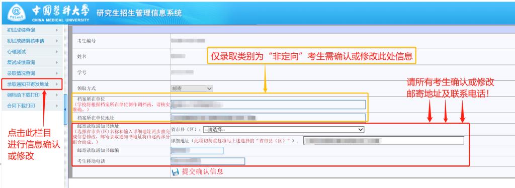 確認(rèn)方式:登錄中國醫(yī)科大學(xué)研究生招生管理信息系統(tǒng)確認(rèn)錄取通知書接收地址及聯(lián)系電話等信息,具體操作流程如下: