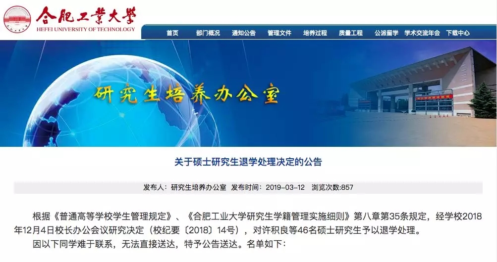 2019年3月,合肥工業大學擬對46名碩士研究生予以退學處理,因其在學校規定的最長學習年限內未完成學業,或超過學校規定期限未注冊而又無正當理由,且未經請假離校連續兩周未參加學校的教學活動。